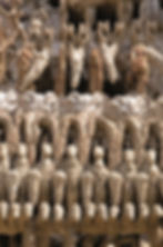 Diese entdecken den Bau gewohnt von der Ostfassade her. Hier nahm das monumentale Unternehmen im Frühjahr 1879 seinen Anfang. „Molassesteine, unbearbeitet, aber mit erstaunlicher Sicherheit zusammengefügt, tierförmige Kiesel, in ihrem Karzer aus Mörtel gefangene Muscheln, rudimentäre Becken und komplexe Nischen, alles hier zeugt vom ersten unwiderstehlichen, ununterdrückbaren, uneindämmbaren Schaffensimpuls“, beschreibt Gérard Denizeau in seiner 2011 veröffentlichten Monografie den ältesten Teil des Palasts. Durchaus programmatisch war der Urbau, den Joseph-Ferdinand Cheval (1836 bis 1924) dem Boden seines Gemüsegartens entsteigen ließ, die „Source de Vie“: ein „Lebensquell“, dessen verstummtes Plätschern wie subliminales Gemurmel noch in der Luft zu schweben scheint (die Fontäne ist, wie alle anderen Wasserwerke des Palasts, aus konservatorischen Gründen längst nicht mehr in Betrieb). Rechts und links umrahmen den versiegten Quell ein ägyptisches Mausoleum mit gewaltigen Trommelsäulen und die durch steinerne Palm- und Olivenbäume, Feigenkaktusse und Aloen gekrönte „Tour de Barbarie“, über deren Fassade sich drei langgezogene Riesen hinstrecken, mit Wämsern wie aus geschorenem Schafsfell.